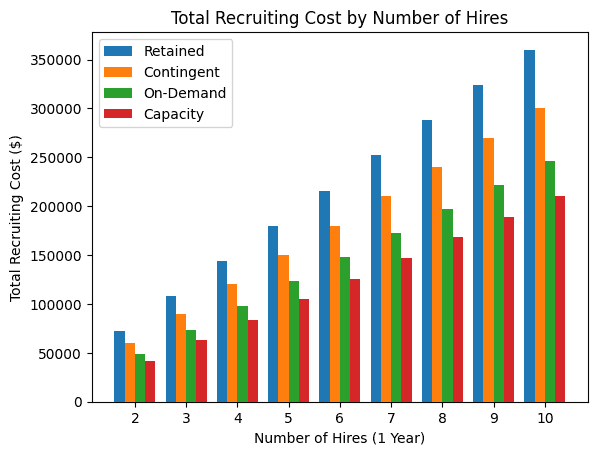 While individual searches may appear comparable, capacity-based recruiting often leads to lower overall cost per hire as hiring volume increases, due to greater efficiency and reduced duplication of effort.